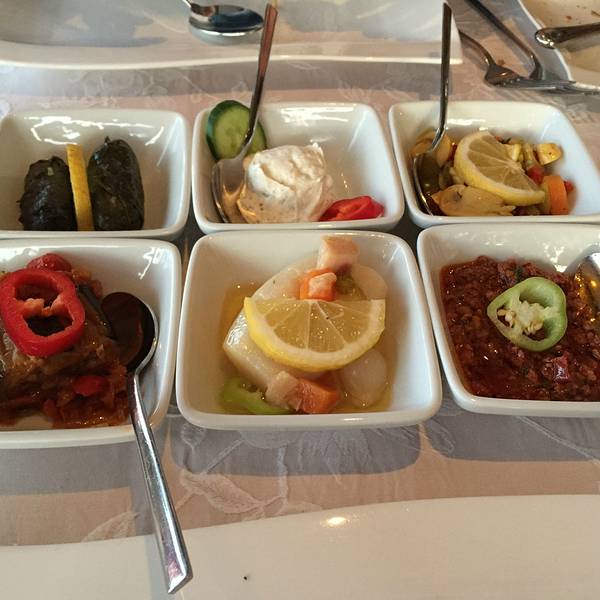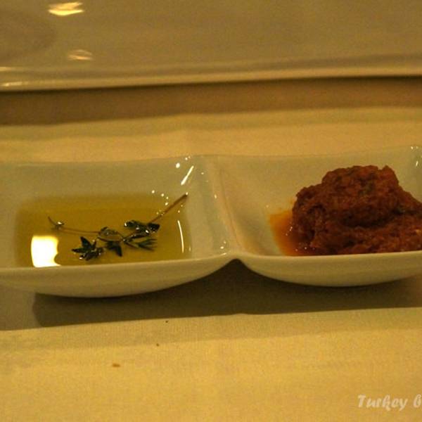 晚餐我们预定了Imbat,这是Tripadvisor上评价最好的酒店之一,位于Gulhane电车站沿轨道下坡几步的地方,Oriental Hotel的7楼。这家是我们在土耳其吃得最好的,点了一份烤羊腿,一份Pasha's Stew,一份甜点拼盘。本来还想点一个冷菜拼盘,然后侍者说我们吃不掉的。一共花了85TL,比起之前的坑爹鱼市要好多了。这家店俯瞰着海峡,菜肴的服务的总体水准接近于波尔图的米其林餐厅The Yeatman,非常值得尝试。 面包是免费的,配了蘸料。
