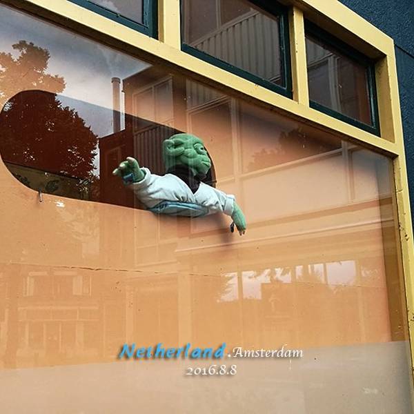 站在车站出口,大概是被冻傻了,某人一向很灵光的方向感歇菜了,反正地图看半天,都没确定往哪儿走。幸亏一穿着羽绒服的荷兰姑娘很了然的朝我们一指身后,说风车村往那儿走。桑斯安斯风车村地图一张萌萌的尤达大师,好想抱回家一路的雨哟,时大时小,某人带的伞很便携,所以并不大,要遮住俩体积比较大的人已然很艰难,还要护着我俩的包,那个捉襟见肘啊。后来某人直接就把伞遮我头上了,他淋雨,我当然不肯啦,好吧以下省略秀恩爱词句若干,总之,我只能牢牢护着我的宝贝单反,把它裹在风衣里,而自己任凭雨打风吹,我自瑟瑟发抖。就这样还坚持着用手机咔嚓几下。到了开合桥上,雨又小了,云层又透出些金光,无意中一回头,却见天空中横跨了一道巨大的彩虹,这算是老天给我的补偿么?哈哈。走到风车村里,路上一个人都没,要不是雨势又大了起来,那该是多么惬意啊。某人短袖短裤凉鞋,即便脂肪略厚,也有点扛不住了。