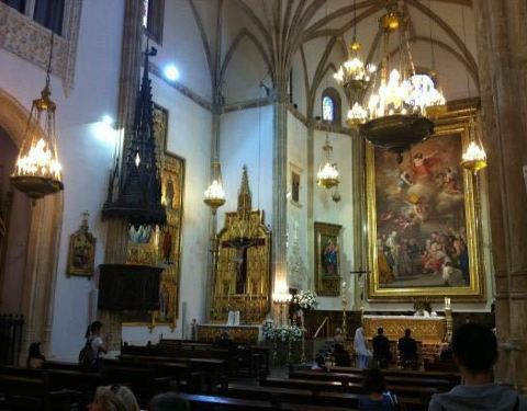 这个教堂就在普拉多博物馆的旁边,远看好像挺小巧的,近看还挺宏伟的,需要从他的侧门进去,他进去的两旁有很多的壁画,很多中世纪时候的风格。