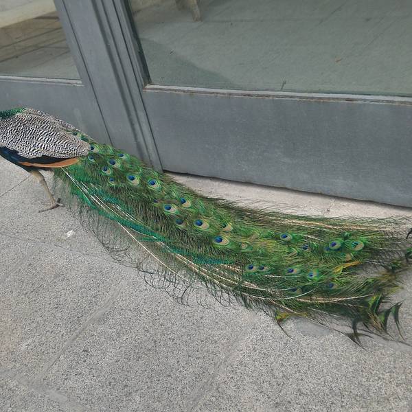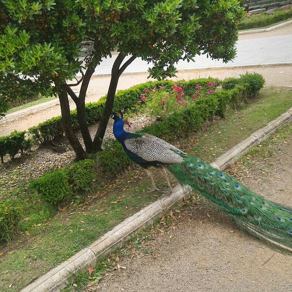 我们往另一个方向走,是一片幽静一点的小花园,还有小水塘,真的看到有孔雀在草地上闲庭信步。三只公的三只母的,公的孔雀拖着长长的大尾巴,母的则看起来像是野鸡,朴素地很。每当母孔雀靠近公孔雀的时候,公孔雀就哗啦一下开屏了,这几只争奇斗艳开屏大概开了有十几分钟之久,刚开始觉得很新鲜很漂亮,后来慢慢也就习惯了,估计正好碰到它们的发情期?