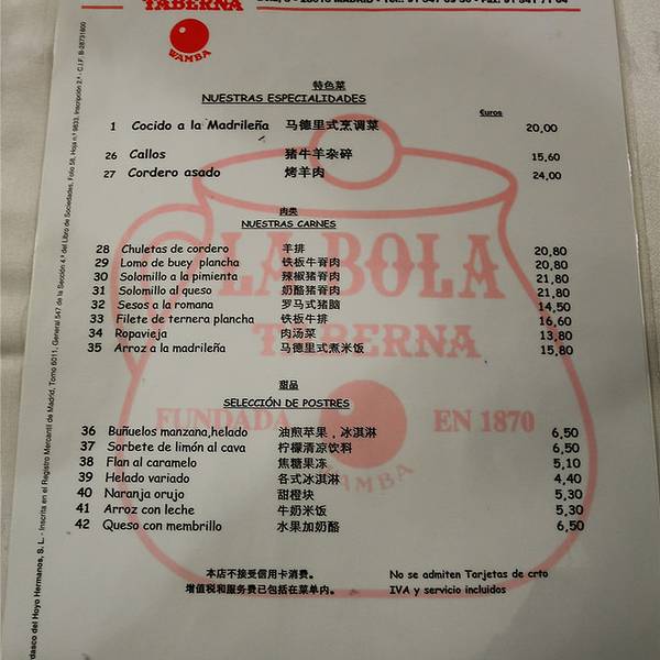下面这家餐厅要重点推荐下,我们是在《走遍全球》上看到的推荐的吃马德里肉汤的地方。这家餐厅离东方广场不远,就在bola大街上,餐厅的名字也是叫la bola,餐厅中午13:30开门,我们13点去到,门口的老爷爷说叫我们过半小时再来,我们就先预订了一下,同时看到别的人也是拉着拉杆箱就来了,估计名声在外,这家餐厅很有历史了,里面的装修挺复古的,上面有很多名人到访餐厅的照片。另外一个惊喜就是,居然有中文菜单哦!(菜单请见图片)