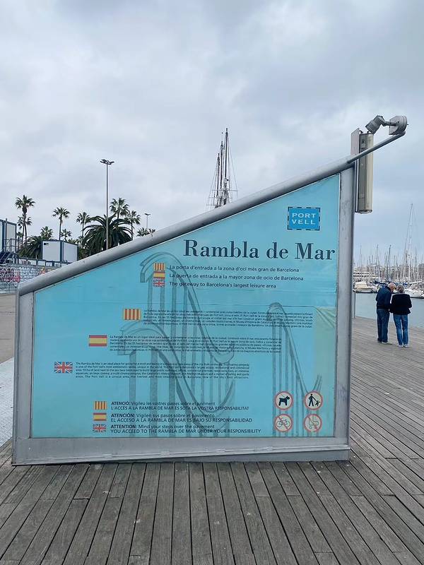 港口边停泊了很多游艇,走过长长的栈道就到马雷马格商场从兰布拉大道走到头就是哥伦布纪念雕像,再往前一点就是海边了,这是巴塞罗那旧港。港口边停泊了很多游艇,走过长长的栈道就到马雷马格商场。
