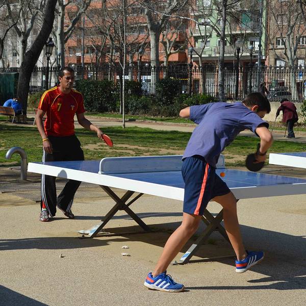 星期天的城堡公园,很多市民在做运动。公园里的乒乓桌旁,年轻人在打乒乓球。喷水池也开始喷水了