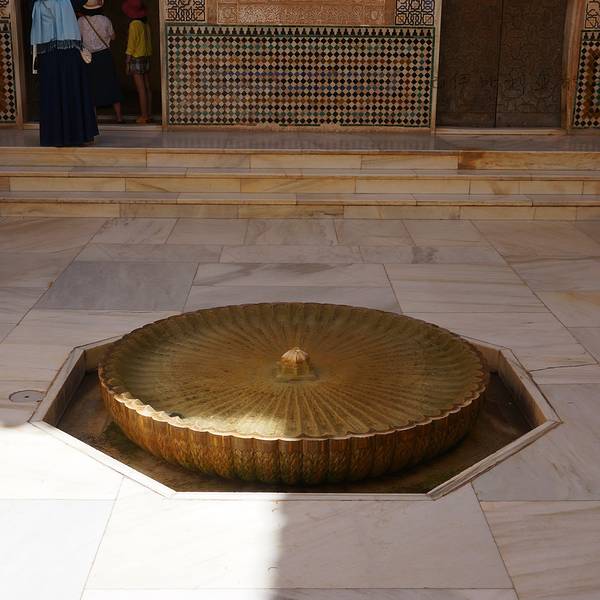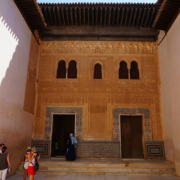 梅斯亚尔宫的庭院:建于1365年,格拉纳达苏丹在位时在这里听取臣民的意见,与大臣召开会议。面对梅斯亚尔宫的建筑立面曾采用黄金贴面,如今黄金贴面已剥落。庭院中的水景。庭院旁边的小门是发生紧急事件时,供宫殿卫士同行的快速通道。
