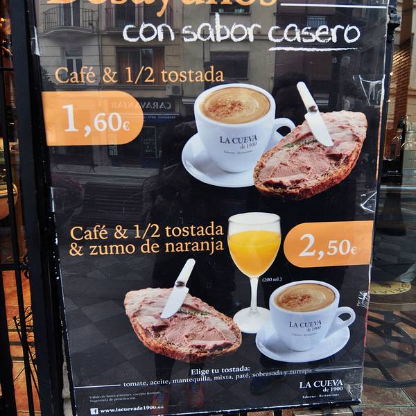 La Cueva de 1900餐厅在格拉纳达的口碑很高,而且性价比极高,早餐套餐平均一人只需要3-5欧就可以搞定,面包酥脆咖啡醇香,总之比较推荐。但是如果需要赶路的话还是不推荐来这里。因为上菜速度实在太慢,一个早餐足足花了我俩半个多小时的时间,习惯了快节奏都市生活的人实在坐不住哇。