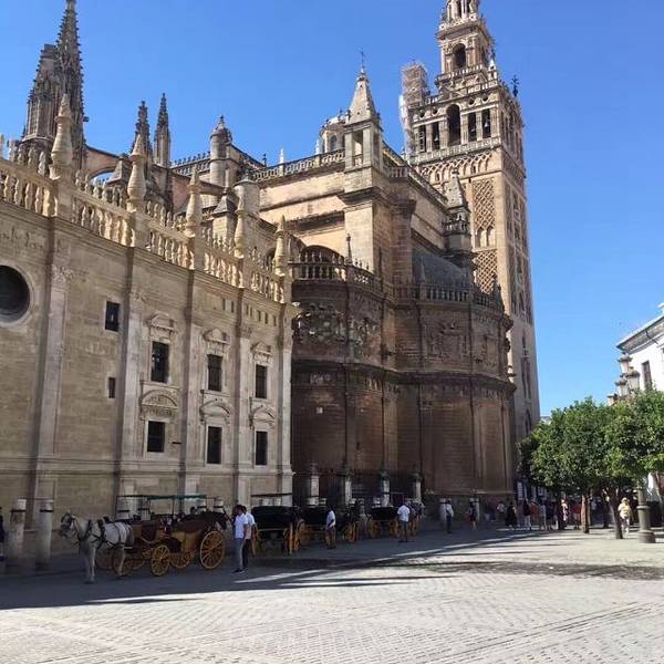 塞维利亚大教堂的确非常大,绕着外面走一圈也需要一点时间。不过教堂排队的人实在多,所以最后只有放弃了塞维利亚大教堂的确非常大,绕着外面走一圈也需要一点时间。教堂高耸的塔楼很有特色,据说里面为了能上马车没有楼梯而以坡道取而代之。不过教堂排队的人实在多,所以最后只有放弃了。