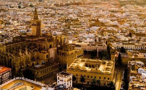 在主教座堂后面的广场上正在举办画展,游客们可以免费欣赏。导游说大家在这里碰到面带笑容的吉普赛人上来跟你打招呼,要给你的手上套上红绳子说给你带来好运,请谢绝,因为这通常都不是免费的。再往前走一点就是西印度群岛综合档案馆(Archivo General de Indias),坐落在一座美丽的古老建筑里面,这里曾经是古代商人的交易所,算是古代的证交所了吧。如果对西班牙历史特别有兴趣的可以去里面免费参观,它收藏了许许多多宝贵的资料,包括哥伦布的航海日志等等。