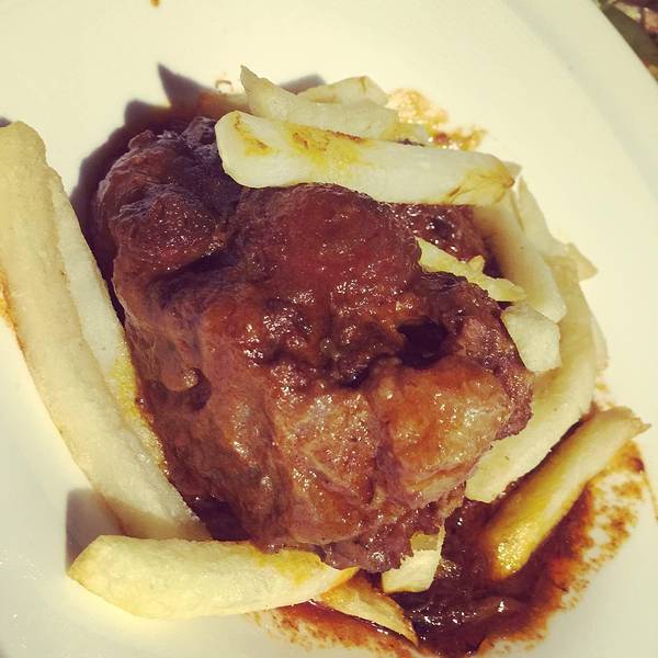 胖子一意孤行认为天气不会变坏,那好吧,我们先吃饭再登钟楼,午餐选择了LP推荐的Casa pepe de la Juderia,虽然LP推荐的可以看见清真寺的非常棒的天台在冬季关闭,让人有点小失望,但是这家餐厅的菜味道还是不错的,火腿奶酪沙拉里面加了醋浸的豆子和葡萄干,口感很奇特,胖子的烤乳猪就是一只小猪肘,不过不知道为什么我点的牛尾上来却是一整块的牛排……