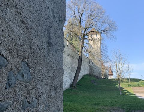 城墙据说是瑞士当时的防御性城墙,我们登上城墙,可以看到卢塞恩的城景,因为当时有点下雨,没有找到...这个景点是免费的,导航带我们走过去,城墙据说是瑞士当时的防御性城墙,我们登上城墙,可以看到卢塞恩的城景,因为当时有点下雨,没有找到城堡那块。