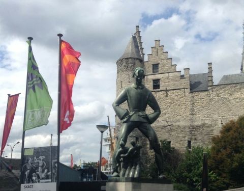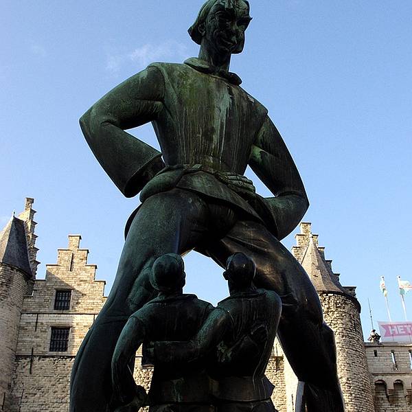 城堡入口处,一尊巨人Antigoon的青铜像,从另一个角度,讲述着安特卫普的历史和传说。斜坡下的船锚,蓝天下的城堡。斯滕城堡(Het Steen),正门入口。进去是一个小天井,因为长年背光,显得有些阴冷。靠街的缺口处,是一个十字架。穿过城堡,背对斯凯尔特河,回望安特卫普。一座锈迹斑斑却不失威严的英雄像,正对着矗立在斯凯尔特河畔,脚下还有敬献的花篮。转一圈回来,阳光照在斯滕城堡,生机勃勃的爬山虎,攀在墙上熠熠闪闪。城堡边靠近河岸的地方,是摆放船只的仓库,栅栏隔不了夕阳,挡不住身影。感觉这里也是博物馆的一部分,里面的各种船只,都像是陈列的展品。离去前,又看到巨人的铜像,便很想回大广场,找勇士布拉博来帮忙。 展开