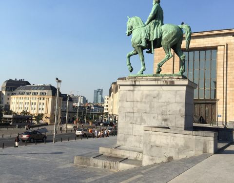 在艺术丘的最底端,是一座青铜的巨大雕塑,这个骑士正是比利时第一次世界大战的民族英雄——比利时第三任国王 Albert I。和这个骑士隔街相望的还有一尊老妇人的雕像,这个老妇人则是国王Albert I的妻子皇后Elisabeth,两个都精准地站在 Mont-des-Arts指向高丘皇家教堂的中轴线上,这组就是国王皇后纪念雕像 (Albert I & Elisabeth)。