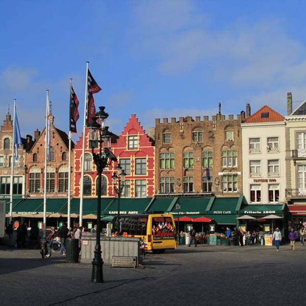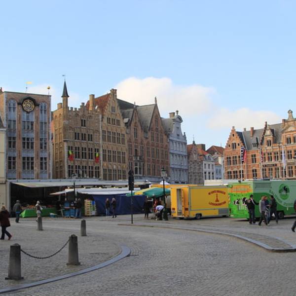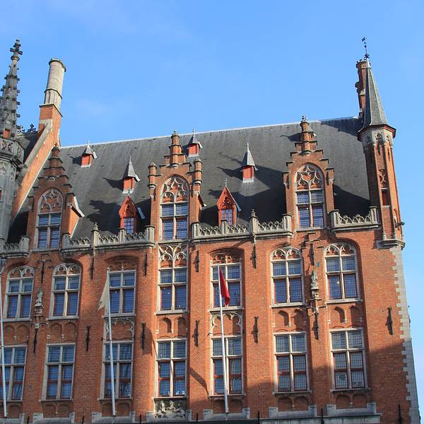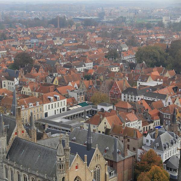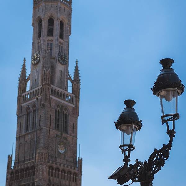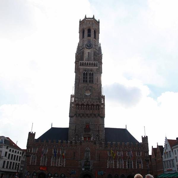 在布鲁日的市集广场矗立着古老的褐色钟楼:三次损耗,三次重建,它仍然观看着城镇。
