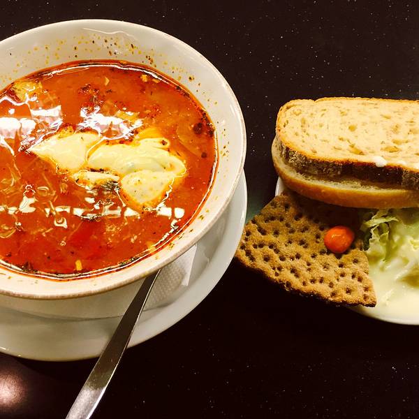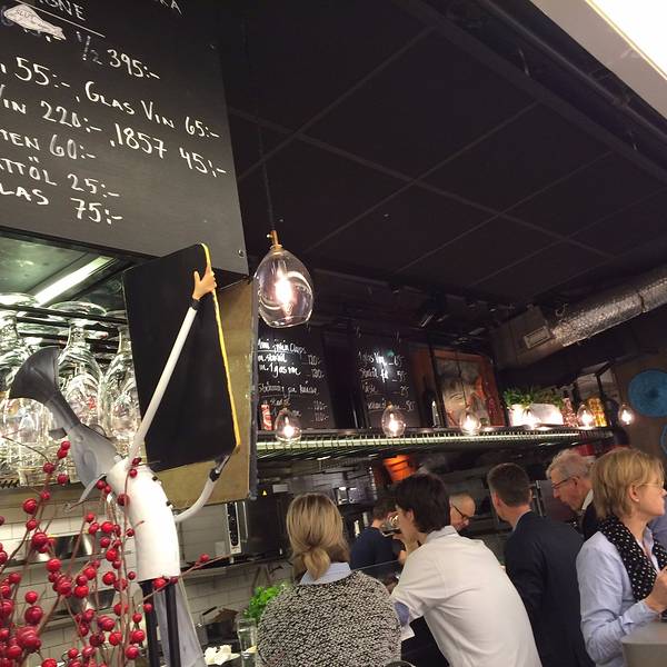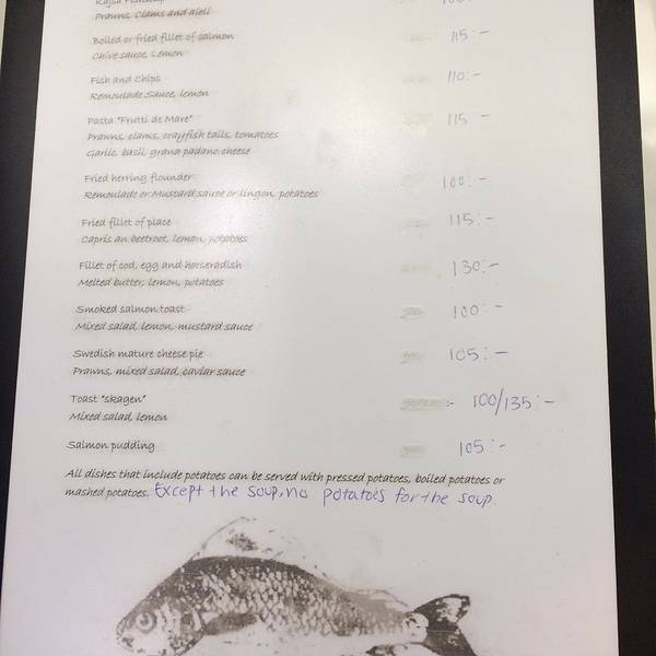 回到斯德哥尔摩,我和嘉姐在火车站存了行李。下午4点多的北上的火车,我俩定好见面时间就又分头行动了。她去逛老城,我打算先去买一副专业的保暖户外手套(我可不想把手指头冻掉了)然后再去市场喝传说中的kajsa鱼汤,最后回火车站里面的超市采购去Abisko的食物。 大名鼎鼎的Kajsas Fisk & Restaurang 就隐藏在中央火车站旁边Hotorget地下市场里。餐厅挺大挺好找,基本上一直有人在排队。 餐厅里坐着很多当地老人,服务员兼厨子也是不苟言笑的白胡子大叔。 鱼汤性价比奇高,一碗95克朗,喝完了可以续碗(管饱!)旁边面包蔬菜沙拉无限自取! 其他的菜品价格也很便宜,基本上是鱼排啊,炸鱼薯条或者salmon open sandwich,都是一百二三十克朗一份。
