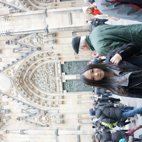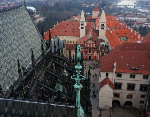 城堡故事展这一带算是市中心了,很热闹~我们从城堡侧面进入,买了去塔顶的门票,顺着一道狭窄的旋转楼梯爬了十几分钟,爬得快断气,终于气喘吁吁的到达了一个能俯瞰整个布拉格的位置。