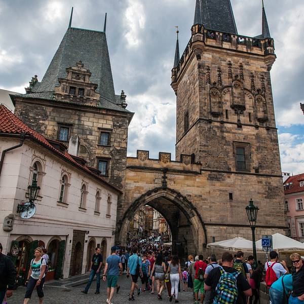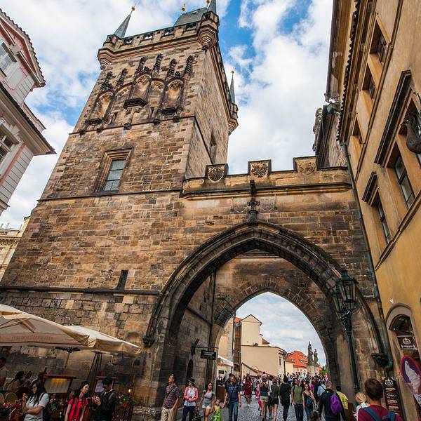 小城桥塔与老城桥塔同样都是哥特式的建筑,黑色的尖顶,但是在造型上有些细微的差距小城桥塔与老城桥塔同样都是哥特式的建筑,黑色的尖顶,但是在造型上有些细微的差距。小城桥塔其实是有两个不同高低的塔身,中间有一座拱门相连接,行人穿过拱门,从查理大桥进入小城广场。