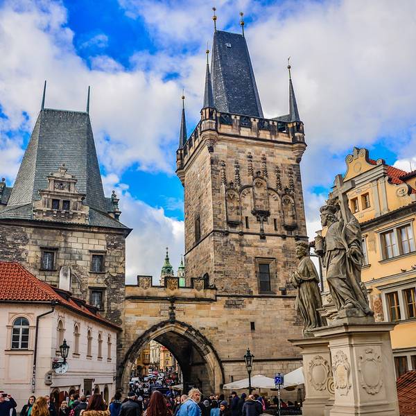查理大桥西头由小城桥塔(Malostranská mostecká věž)镇守,是一高一低两座塔楼查理大桥西头由小城桥塔(Malostranská mostecká věž)镇守,是一高一低两座塔楼,中间由一座哥特式拱门相连。靠南边矮的那个是查理大桥前身朱迪思桥(Juditin most)的一部分,因此又称朱迪思塔(Juditina v...查理大桥西头由小城桥塔(Malostranská mostecká věž)镇守,是一高一低两座塔楼,中间由一座哥特式拱门相连。靠南边矮的那个是查理大桥前身朱迪思桥(Juditin most)的一部分,因此又称朱迪思塔(Juditina věž)。朱迪思桥建于1158-1172年弗拉迪斯拉夫二世(Vladislav II,1110-1174)统治期间,以当时的王后朱迪思的名字命名。它原本是一座罗马式塔楼,1591年垛口被文艺复兴风格装饰面所取代。较高的哥特式塔楼于1357年与查理大桥同期开建,由彼得•帕尔莱勒设计,直到1464年才最终完成。塔楼上方的壁龛里原来应该是有雕像的,现在已不知去向。 展开