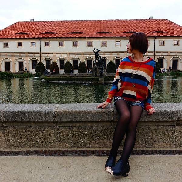 从城堡黄金小巷那个后门下山,再转进小城广场,沿途就能经过华伦斯坦宫。有着非常非常漂亮的花园,一池飘落着花瓣的碧水和几只顾影自怜的鸽子吸引了我们好半天