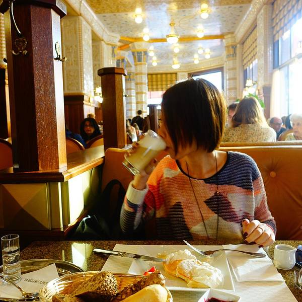 之前光顾着激动,等劲儿过了,才发现肚子饿的不行,美食配美景,打算好好的吃个brunch,这样才不辜负如此美好的日出。之前攻略里看到有人极力推荐皇家咖啡馆(Café Imperial),查了查离火药塔挺近的,就拖着大姆哥过去了。 官网: http://www.cafeimperial.cz/en/ 皇家咖啡馆擁有着超过百年的历史,是世界十大最美咖啡馆之一。刚进门马上就里面的装潢给震惊到了,满满的宫廷风,象牙立柱撑起的大厅,宽敞而明亮,整个墙面和天花板都用瓷砖拼贴出了华丽的图腾。能坐在这样的一座咖啡店内用餐本身就是一种享受,至于价格,说实话,真心不贵,你绝对负担得起,有机会的话千万别错过哟。