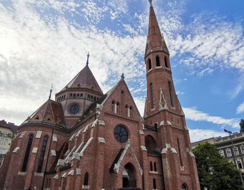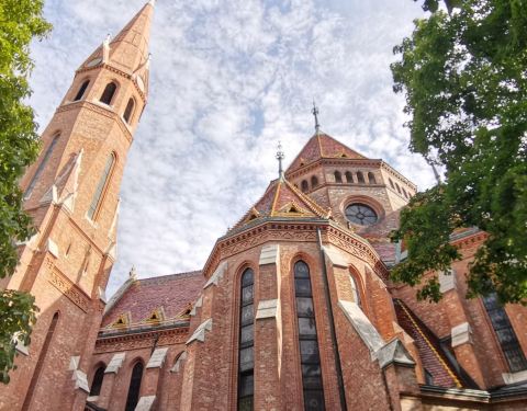 从渔人堡沿着一段段的楼梯下来走到河边,抬眼就能看到这座独特的红砖装饰着白边的教堂