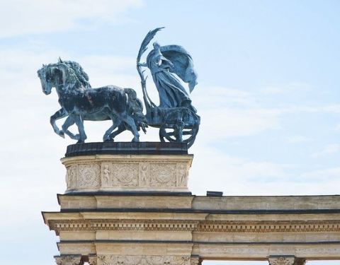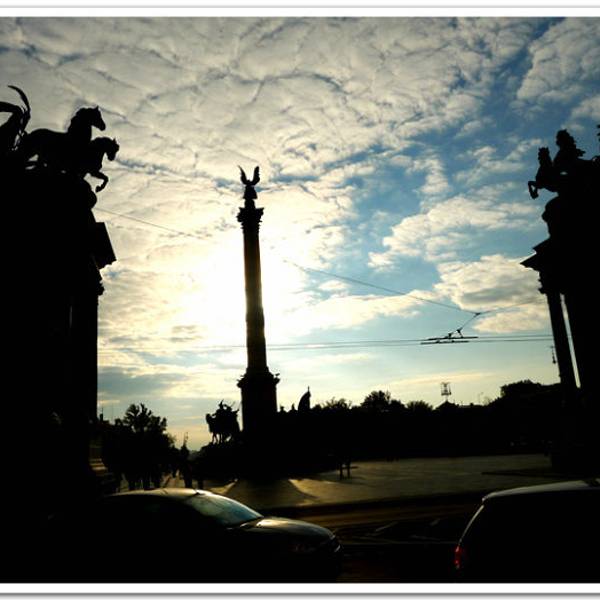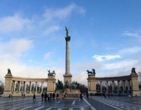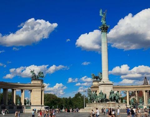 英雄广场是布达佩斯宏伟的建筑群之一,有很高的历史、艺术价值。位于东北部安德拉什大街的末端,为庆祝匈牙利建国1000周年而建,来纪念经战争浩劫的匈牙利人民和民族英雄。每逢重大节日广场都会有盛大的庆祝仪式。 漫步广场 漫步英雄广场,可以先驻足欣赏广场上精美的建筑。广场中心矗立着高达35米的千年纪念碑,顶端是大加百利天使雕像,加百列手持加冕王冠,驱车前行,威风凛凛。纪念碑的底座上有七座匈牙利祖先马扎尔民族部落首领的雕像。纪念碑的后方环绕着对称廊柱建筑,廊柱间并列放着14尊青铜像,他们当中有匈牙利的历代国王,也有为独立战争做出巨大贡献的王侯将相。 广场的西侧是美术博物馆,东侧是布达佩斯艺术宫,两座新古典主义风格的建筑简洁大气,遥相呼应,门廊的科斯林圆柱很有希腊神庙的感觉。广场的地面用青白两色水磨石铺成,开阔得足能容下20万人。 游览贴士 要想拍广场全景,要站在英雄广场(Hősök tere)地铁站出站口处,用带广角的镜头拍摄就更好了。夜晚在灯光的照耀下,英雄广场景色更为壮观,喜欢摄影的朋友一定不要错过英雄广场的华美夜景哦。 参观完英雄广场,可以去广场正对的安德拉什大街逛一逛,看看这条被列入世界文化遗产名列的有名大道;也可以去广场北面的市民公园溜达溜达,划划船、喂小野鸭,在塞切尼温泉好好享受一番。