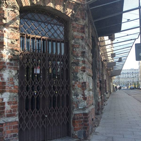 这是一条通往隔离地的短街,街对面的犹太剧院是二战中幸存下来的建筑,上面的战争痕迹清晰可见。往南几个街区,还有二战后遗留下来的残破的红色砖墙,是曾经围困华沙犹太人的地方。