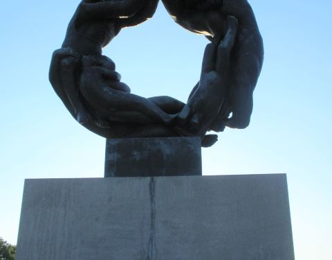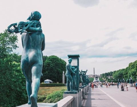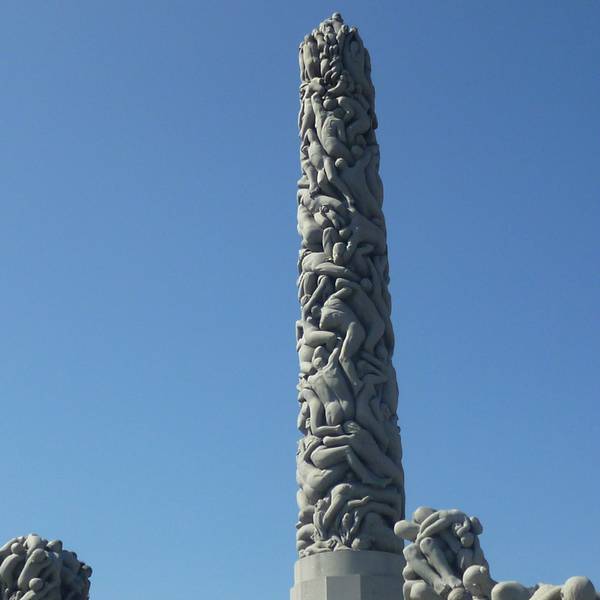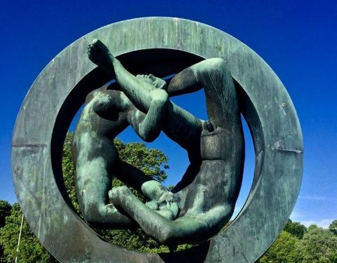 挪威雕塑师维格朗晚年时花费20多年心血精心完成了近200座神态迥异的人物雕像,总共有650个人物浮雕。这些雕像全部矗立于首都奥斯陆的西北角的维格朗雕像公园。走进这座绿意盎然的公园,可以看到开阔的草坪、茂盛的树林,还有池塘等景观,是人们散步和野餐的好地方。公园中间的人行道两旁错落有致地排列着各种与真人一般大小的雕像,而这里面比较有名的是一座17米高的生死塔,塔上雕刻了121个人物复杂地纠缠在一起,描绘了世人不满于人间生活而向“天堂”攀登时,相互倾轧和相互扶掖的情景。这些雕像都是由铜、铁或花岗岩雕成,它们以各种姿态诉说生活、诉说人生。走在公园中就像来到了户外美术馆,这里据称也是世界上较大的雕塑公园。