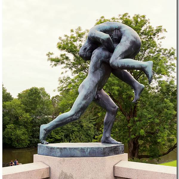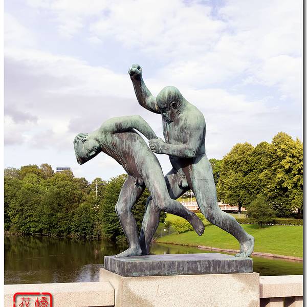 公园里像这样的雕塑有很多,动势精准,又隐隐的憨态可掬。站在高处俯瞰整个公园,整个公园的布局很规整以挪威雕塑家维格兰的名字命名,公园里有上百座以人体为主题的雕塑,从婴儿到年老,展现生命这个主题。