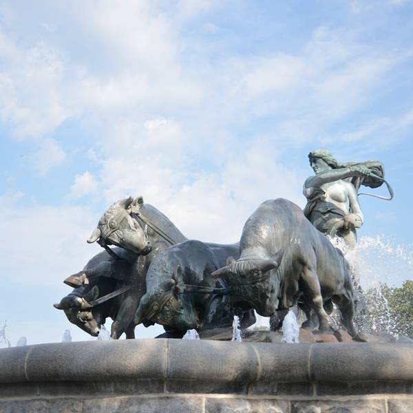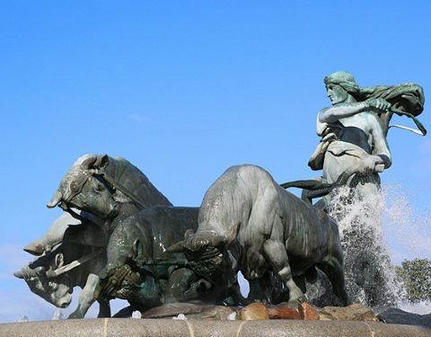 在哥本哈根市的长堤公园内,除了著名的小美人鱼铜像外,还有座同样闻名于世的吉菲昂喷泉,蕴含着历史悠久的北欧神话。 喷泉由盖费昂女神、四条牛及套犁等一组铜塑组成。盖费昂是北欧神话中的一位女神,这组雕像则述说着一段女神与哥本哈根所在的西兰岛之间的渊源:由于女神受命要在一天内把所有土地耕完,她只好把四个儿子变成四条公牛,终于把西兰岛在一日内耕完了,而西兰岛从此归她所有。