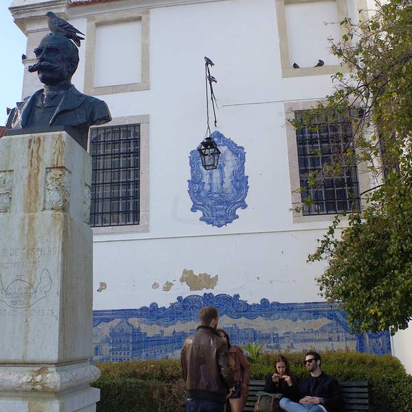 这个地方是我们去圣乔治城堡路过的,觉得好有趣就停留了一会儿。 我们也不知道雕像是谁,只知道“他”深受那只胖鸽喜爱,仿佛头上涂了胶水,紧紧沾着胖子的脚丫。 那胖子镜头感很强,虽然脚被“粘住”了,身子还会随着镜头转动。 墙上的两块有磨损的花砖,透着古老的气息,屋顶憩息了好多鸽子。 这里还有一些供人小憩的长椅,走累了,可以稍作休息,停下脚步,看看风景,也是不错的选择。 不远处的悬崖边,还有一条短短的走廊,站在边上可以远眺里斯本的河山群屋,身心放松。