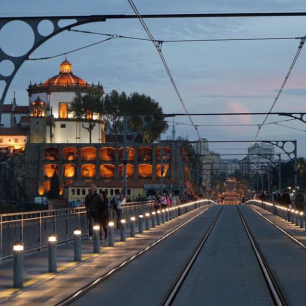 单程票价:2.5欧元▼缆车一出来,就是一个观景台,很多人跟我们一起坐在这里,看着河、吹着风、等日落。▼路易斯一世大桥的另一面▼日落▼黄昏的桥上,与后方的圆柱山修道院 展开