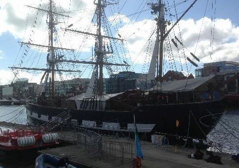珍妮约翰斯顿大船停靠在利菲河畔,靠近入海口的都柏林港区,这艘船是一艘1850年移民的复制品,一艘比较复古的船,同时也是一个博物馆,可以了解爱尔兰的饥荒历史。