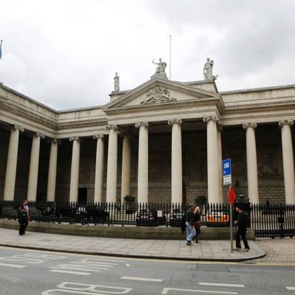 从圣三一学院的正门出来,右手一侧的道路的北面就是爱尔兰银行大楼。这个壮观的建筑建于1729年,是全世界第一座专门为议会修建的建筑。整个建筑以帕拉第奥(Pallsdio)工整严谨的风格为基调,建筑主体呈半圆形,占地接近6千平方米。