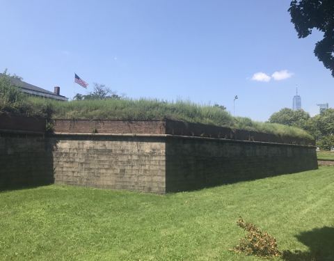总督岛就在曼哈顿岛南码头南侧,渡轮5分钟就到。周六日上午11点前免费,11点以后3美元轮渡费。岛上有二个堡垒,一个在上码头边上是圆形的,一个在岛东北部,下沉式堡垒,五角边,外有壕沟,堡垒内面房子围城一个方形建筑。岛上看自由女神角度也不错。