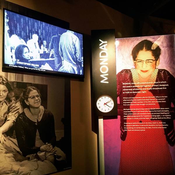 周六现场的特展,在纽约第五大道上,MetLife大楼下的主干道右侧的417号,非常显眼的位置,近期从早上10点到晚上7点,学生票24刀一张,成人票29刀一张。整个特展,一般可以逛1个小时到1个半小时。进入后,现有一个10分钟的影片介绍,此后,从门口的红毯穿过,可以拍一些照片,即可进入电视影视主体展示区。第一个展示区有CNN每周一到周六的各档节目介绍,近50年的节目变迁,从墙上的黑白电视机里,一清二楚的表达出来。与此同时,当时编剧及电视台作家所用的办公场所,也被原封不动的还原了。其中,40多年前的编导组合照,让人极为印象深刻,所有的电视幕后高手们都席地而坐,随意的吃着沙拉和披萨,非常有美国特色。展示区的木板上,便签纸清晰的展示了周六当天中午的各档节目安排,以及相关的负责人。在墙壁的对面,则更有周六夜现场节目厚厚的,用记号笔写得题词版。如果喜欢的话,还可以坐在这一工作区,想小伙伴一样,假扮一下节目写题词版的实习生,又或者是负责节目场景设计的美编,体会一番真正当系列节目编导、制作人的使命感和成就感。在第二个展示区,则有《周六夜现场》拍摄地的整体场景模型,不知为何,看到这个会想起国内芒果台的天天向上等节目。当然,也有当年拍摄原封不动的客厅,沙发的位置,斜倚在墙上的电吉他和音箱,随时会冲出来咬人的电鲨鱼,一切的一切都如此真实。当然,来到这里,你还有可能进入到节目的后台,亲临导播室感受一番当年节目倒数录制时的紧张感。而最后的环节,则是会有一档10分钟的经典节目展示,现场布景、乐队均完全真实。而白色幕布上生动活跃的女主持,以及立体声的环绕音响,更是让人放佛置身于那个美国的电视黄金年代。如果是节目某主持或嘉宾的粉丝的话,还可以在出口处的纪念品商店购买其卡通形象的玩偶,留作纪念。整体来说,这个特展是洛克菲勒中心圈内很值得一逛的,对了解美国近50年电视传媒发展史很有帮助。