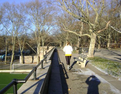 沿着哈德逊河的汽车马路。道路旁边就是自行车道和人行道,有不少人在这里跑步,锻炼。