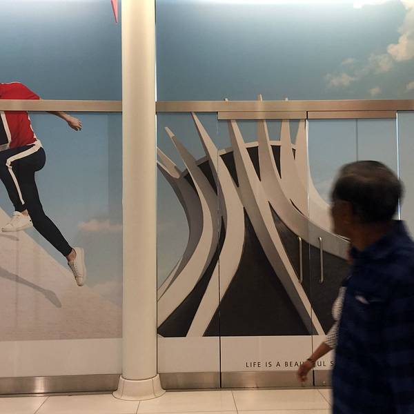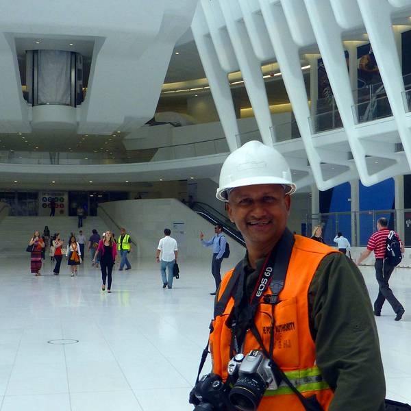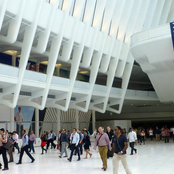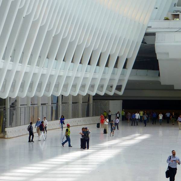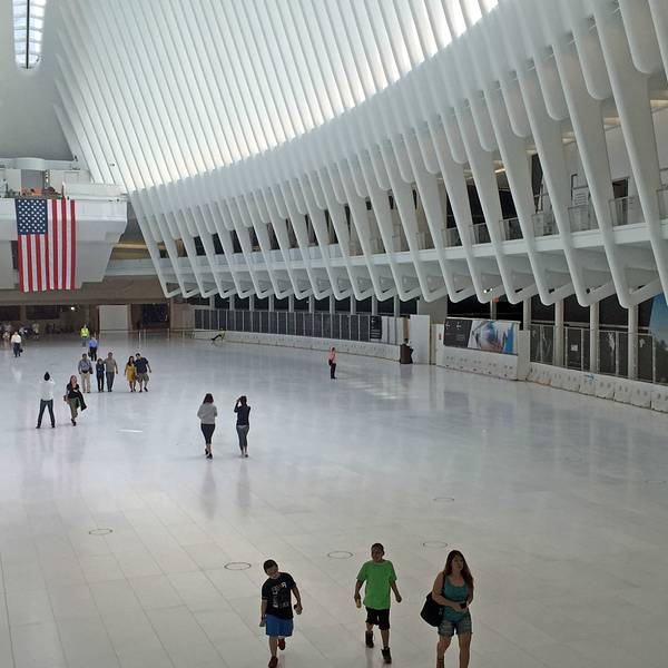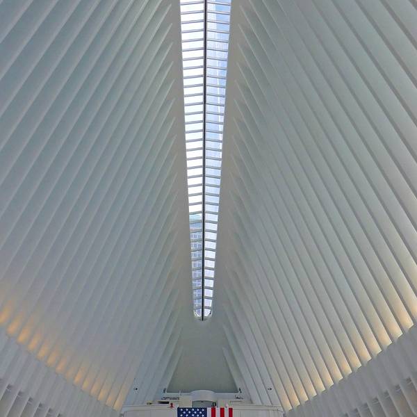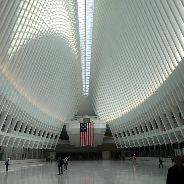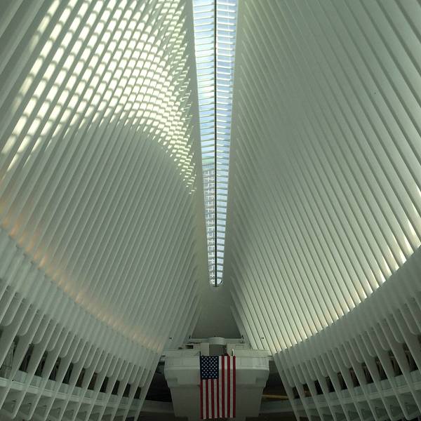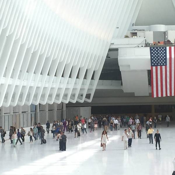 金骆驼 在纽约我们游览了新落成的世贸中心地铁站,也叫纽约地铁富尔顿换乘中心。11纪念池而感动。游客都在拍照在纽约我们游览了新落成的世贸中心地铁站,也叫纽约地铁富尔顿换乘中心。这个换乘中心是集地铁站,换乘,人行步道,还有购物为一体的大型建筑,今年三月启用。接近世贸中心地铁站时看到一座巨大的白色大鸟造型的...在纽约我们游览了新落成的世贸中心地铁站,也叫纽约地铁富尔顿换乘中心。这个换乘中心是集地铁站,换乘,人行步道,还有购物为一体的大型建筑,今年三月启用。接近世贸中心地铁站时看到一座巨大的白色大鸟造型的建筑下阳光下熠熠闪亮,在一片新建的摩天大厦中如即将起飞。我们走进地铁站,步入大厅顿时十分震惊,富丽堂皇,前卫,充满现代感。顶部无数条白色钢管和玻璃构建组成椭圆形,中间有一道空隙,投下自然光线。白色的构建有强烈的反光效果,抬头望去犹如一只巨型明亮的眼睛。正中间悬挂一幅巨型星条旗。这个建筑有个名字叫眼睛(Oculus)。建筑十分高大,众多的乘客行走在宽敞明亮的巨大空间里,宁静,舒适,精神振奋,光洁的地面留下乘客的身影。游客都在拍照。一位穿制服挎着照相机的工作人员也在拍照,我们请他为我们照相,问起地铁站一些情况,他总是以微笑回答,可能不便于解答,还是上网查吧。资料说,这是纽约最大的地铁换乘枢纽,有九条地铁线,共27个入口,每天使用的乘客人数达30万人次,还将有6.6万平方英尺的零售和商业办公空间。这个换乘中心耗资14亿美元,建设历时10年,成为又一个纽约地标性建筑。这座建筑由西班牙的Santiago Calatrava设计,他的作品还有雅典奥运会主场馆等