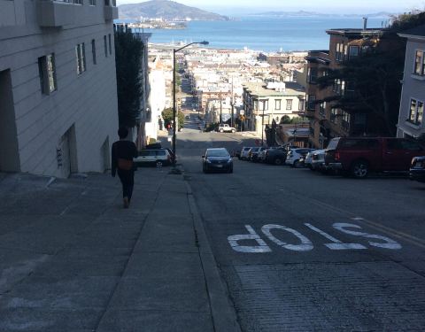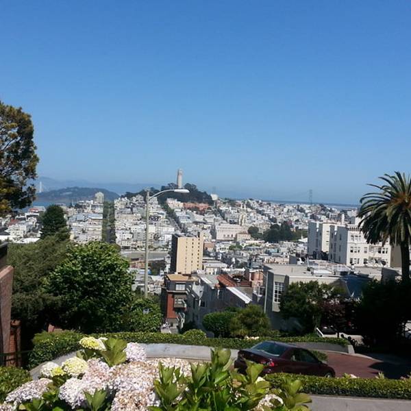 ...坡下坡,不过上去电报山就有无敌的山景,坐那斜坡上我差点滑下去,角度居然接近45度,坐着腿都打颤行走在旧金山真的是一件很痛苦的事,不过感觉跟人生很相似,不断的上坡下坡,不过上去电报山就有无敌的山景,坐那斜坡上我差点滑下去,角度居然接近45度,坐着腿都打颤