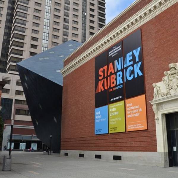 CJMF MoMA街之隔,它更靠近市场街。以犹太裔艺术家创作想法为核心的艺术馆其实是一座承接各种临展的博物馆,他的馆体建筑也非常有吸睛之处,南侧黑钻石形结构诡异坚韧。我和换票的工作人员感慨这结构和我在柏林参观的犹太人纪念馆建筑一样复杂而又内涵,那位young lady立马激动说“对啊,我们艺术馆是同一个设计师Libeskind设计的”!原来CJM是由波兰-犹太裔美国建筑设计 丹尼尔·里伯斯金Daniel Libeskind 在原先的变电所旧址改造而来,改建时还专门保留了原有建筑的部分墙砖以体现新体与旧体的联系。要问这个丹尼尔是哪个,对,就是设计新纽约世贸大厦那个。当前的展览有斯坦利电影展,这位犹太裔美国多面手大导演的片子无人不晓,《2001漫游太空》《闪灵》《发条橙》《斯巴达克斯》《洛丽塔》《拿破仑》每个名字都是响当当······除导演外他还常担任电影制片、剪辑、摄影、音效等工作,才华横溢简直都不够形容。