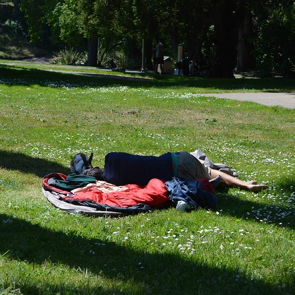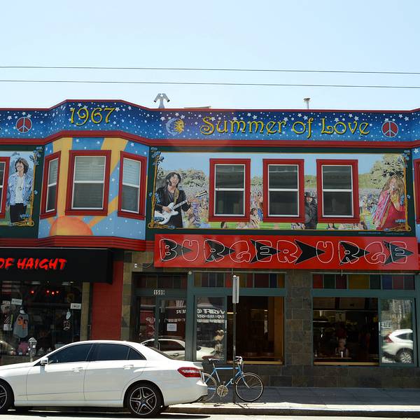 出了金门公园东门我们便直接来到了海特街 Haight。 在公园外的草地上我似乎看见了1967年那个“爱之盛夏”的景象:人们就睡在公园里。虽然40多年过去了,海特区依然还是嬉皮士聚集地。