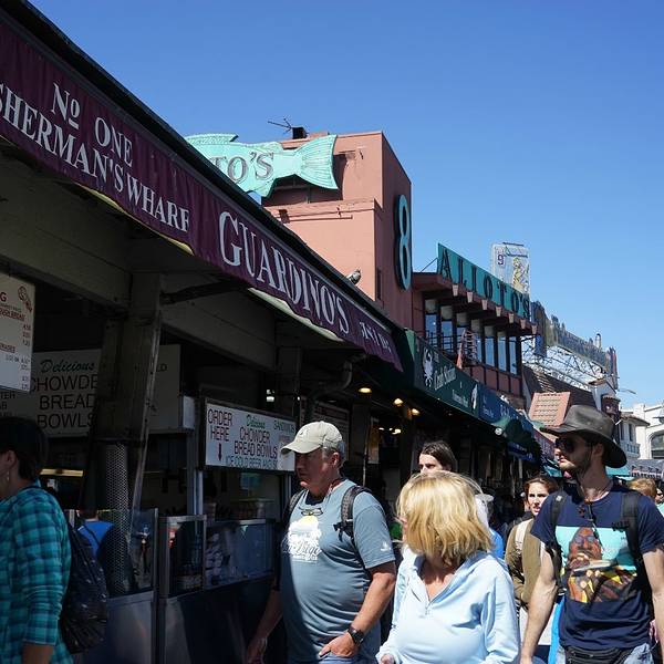 金骆驼 Fisherman’s Wharf(渔人码头)顾名思义是一个为游人建立的商业性码头Fisherman’s Wharf(渔人码头)顾名思义是一个为游人建立的商业性码头。渔人码头的标志性建筑是一个中间画有一只巨大螃蟹的圆形路标,比周围的建筑高出一截,十分的显眼。渔人码头附近有很多家有特色的小店,比...Fisherman’s Wharf(渔人码头)顾名思义是一个为游人建立的商业性码头。渔人码头的标志性建筑是一个中间画有一只巨大螃蟹的圆形路标,比周围的建筑高出一截,十分的显眼。渔人码头附近有很多家有特色的小店,比如有一家叫Boudin面包店烘烤出不同形状的面包展示在窗前,这也是游人品尝海鲜面包的最好地点。除此之外,你还可以拿起造型各异的面包合影哦,工作人员不但不会阻止,反而会很开心。渔人码头最大的功能就是为游客提供了各种海鲜美食。码头的一大部分都是各种各样的小店,有卖超级大只的螃蟹的,我们尝了用面包当碗的海鲜汤,还有鲜鱼做的三明治,都非常美味。或者你也可以选择环境优美,沿海湾的精致餐厅用餐,选择海景座位边看美景边品美食也是十分享受的。 展开
