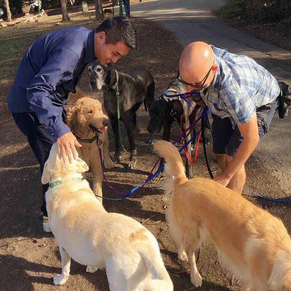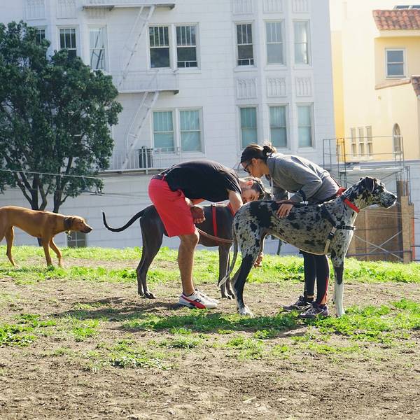 这个广场其实面积也不大 有名的也不是广场本身 而是它周边的整个街区 都是维多利亚时期留存的维多利亚式建筑 感觉一下子穿越到了伦敦老美爱狗是全世界出了名的 有这么舒服的城市广场 不遛遛狗那是万万做不到的 比如这位光头大哥 一手七条狗 老美的狗狗也是一点不认生 舔了我一手的口水好挺拔的身线 好想骑一来到广场的大草坪 就能望到Alamo周边最有名的维多利亚建筑 六姊妹了