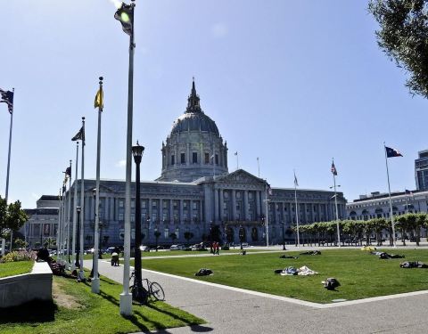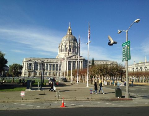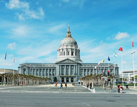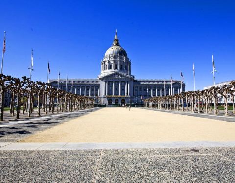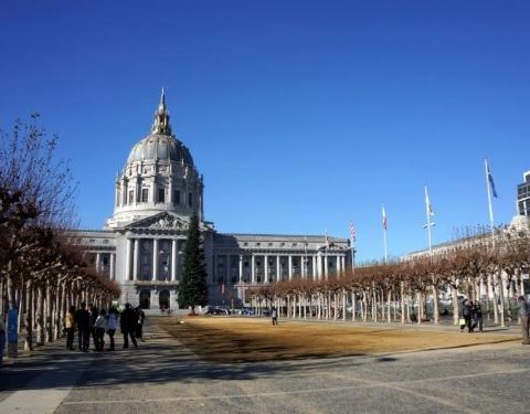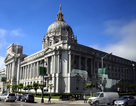 旧金山市政厅是一座令人印象深刻的建筑,旧金山市政厅模仿了圣彼得大教堂的建筑风格,金顶的设计则是借鉴了巴黎荣军院。 市政厅的入口,摆放着法国艺术家创作的精美雕塑作品。进门之后,高挑的市政大厅,四周墙上精美的石雕,让人感觉仿佛走进了宫廷。连接一楼与二楼的是一座非常高大的石梯,登上二楼,便可近距离的欣赏那些精致的石雕像。二楼则是办公室,办公室的门口有两座半身的人像。之后来到的是财税管理办公室,你可以进入拍照参观,但切记不要大声喧哗。 参观完市政厅,在门前的大道上伫立着一座雕像,据说这个雕像是代表了Wisdom(智慧)、 Arts(艺术)、Learning(学习)、Truth(真理)、Industry(勤奋)和Labor(劳动)。