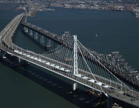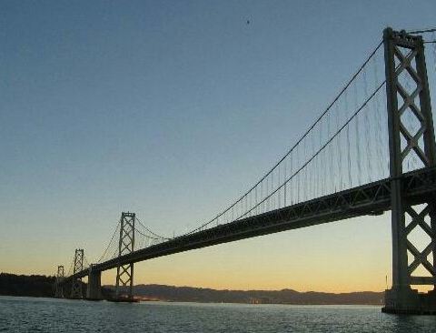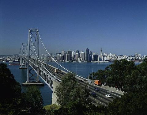 旧金山-奥克兰海湾大桥位于旧金山湾,是一座连接旧金山、耶尔巴布埃纳岛(香草岛)和奥克兰的桥梁。也是横跨美国80号州际公路的一部分,更是世界上跨度较大的桥梁之一。海湾大桥由东西两部分组成,东桥连接香草岛的西岸和奥克兰市,西桥连接香草岛的东岸和旧金山市。西桥是一座由四座索塔组成、拥有六个桥跨的悬索桥,而东桥则是一座悬臂桥。