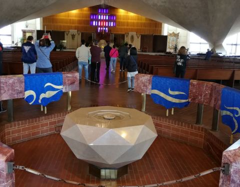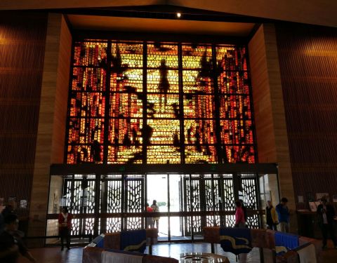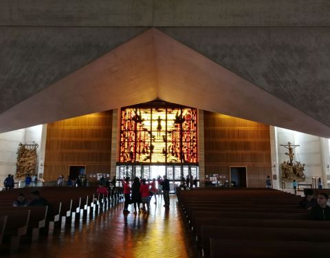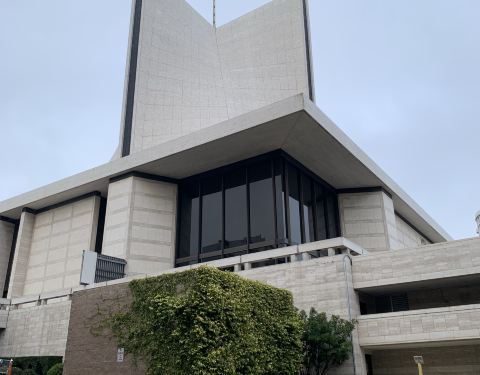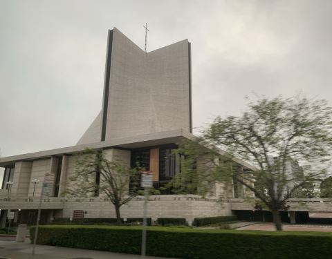 这座圣玛利亚大教堂与其他欧陆式教堂的主流模样有很大不同,风格颇为后现代。原来是华裔著名设计师贝聿铭的作品,几何感极强的外观让人驻足。