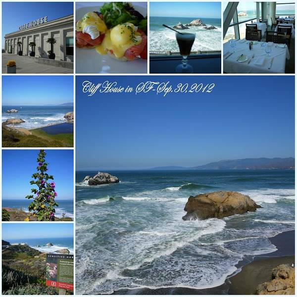 今天时间比较紧凑,看了下地图旧金山的景点还算很集中,第一站先去最远的Cliff House,酒店出门左转就有公交38路两刀直达坐到终点站48th Avenue,大概半个多小时到Cliff House,路上经过Japan Town,当地朋友倒是强烈推荐去那里吃饭,考虑到最近中日关系我还是不敢去了。 这里实在太美了!本来只想喝杯咖啡,现在决定brunch,下午又要去赶景点了在这种地方听听海风,看着海浪拍打着礁石,晒晒太阳享用美食,再来一杯浓烈的爱尔兰咖啡,怎么舍得离开啊?点的烟熏三文鱼配鸡蛋16刀非常美味,爱尔兰咖啡5刀,推荐去楼下的Terrace中午11点营业,隔壁还有家香槟自助餐的45刀餐厅只接受电话预订还需提供美国号码确认,我们比较幸运没订位就直接过去等11点营业。