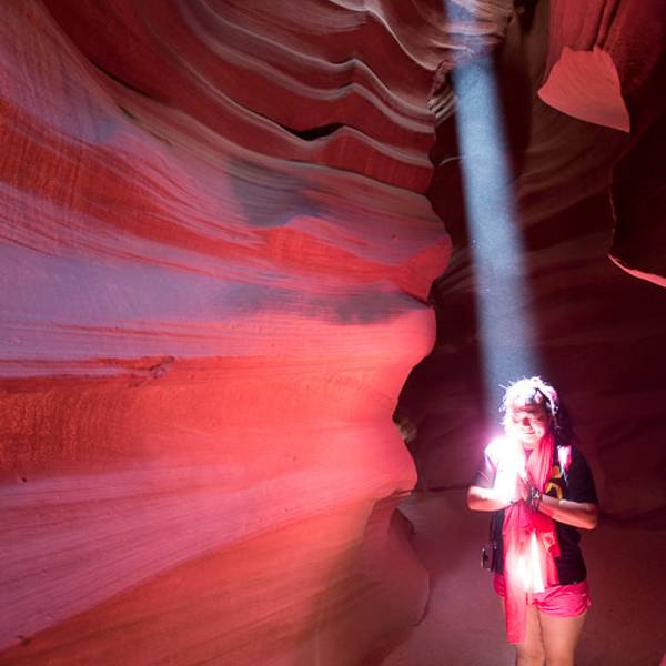 Page估计是美西行中都会去到的点吧,因为那个猪名的羚羊谷。提前几个月就预定了上午11点的tour,因为据说那个时候的光最赞,拍出来的照片最赞。当然,为了光线就要付出代价,这也是最贵的一个时段。其实还有一个更贵的摄影团, 将近两倍的时间和价格,也是唯一一个允许带三脚架的行程。可是对于一个买了单反快6年却只用过3次脚架,每次连快装板都要装错的人来说,的确曾经纠结过那个摄影团,但是一想到三脚架,算了,还是别丢人现眼了。 你是舍不得那两倍的钱吧…… TT在我和他们吐露内心斗争过程的时候,幽幽地吐出这句讨打的话。 付钱的时候,我想要找个认同感来安慰多付出去的几十美金,于是问前台大妈,美女,你最喜欢哪个时间段的啊? 大妈头也不抬,九点半… 妈蛋!! 上了一辆有着诺大的轮子的皮卡改造的敞篷车,很拉风地招摇过市,心中的抑郁也就没那么胸闷了,主路开出没多久就拐进一段沙漠,十几分钟后,一块大岩石般的小山坡挡住了路,到了。 印地安美女向导拿出一把铁锹,开始做行前brief, 我估摸着路应该很难走,一路走要一路翘土,后来才发现,我太naive了。原来是为了把沙尘抛向空中,以折射美丽的光线,帮助游客们拍出好照片,以吸引更多游客前赴后继奔来这里……这也太人造了吧。 狭窄的峡谷里,时常发生水泄不通的状况,因为地方太小,来这里的团队太多了,小伙伴们对于羚羊谷的美好愿景瞬间木有了,只剩下能站在光线里拍出酷酷的照片作为前行的动力。要知道我能拍出下面的无人区赶脚的照片是多么不容易~