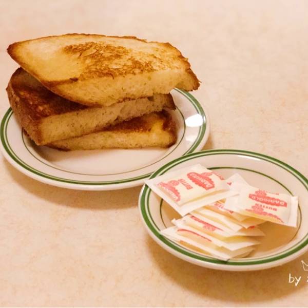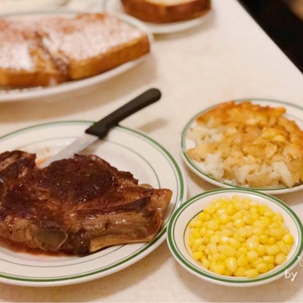 洛杉矶的第一次牛排,感觉美国什么都贵,唯独牛排馆,性价比是真的高!同样品质的牛排,吃下来价格只有国内的1/2左右。 这家牛排馆有百年历史,是名副其实的“老字号”牛排。人气很旺,来吃的都是本地人,黄皮肤黑眼睛的好像只有我们一桌。 环境很复古,有百年老店的腔调,随意又温馨,墙上悬挂着的老照片,也在无声述说着它的历史有多悠长。 肉眼牛排 必点的纽约牛排,一大块,足够两个人分享。牛排肥美鲜嫩,多汁油润,蘸一点海盐和胡椒碎,吃一口超满足的。 餐前面包 现烤的硬欧包,带一点点焦香,搭配 黄油片 ,随意涂抹在面包上就好。 蔬菜色拉 是生菜加色拉酱,还是不大喜欢这种搭配。 法式吐司 一份分量也太大了吧,有点甜也有点腻,不是很爱。 这些吃下来只要50刀,人均不到200软妹币,实在是太划算啦。