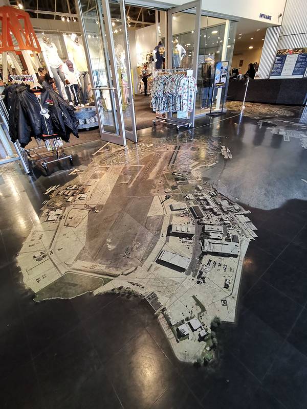 二去珍珠港,航空博物馆入口处地上有地图福特岛F-16飞机工人勤恳地工作