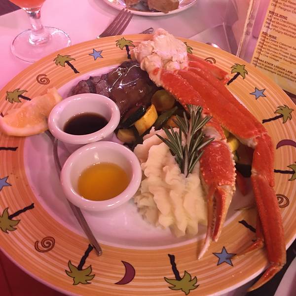 晚5:30~7:30,乘坐“爱之船”游船游海。 我们到达阿拉威游船码头约黄昏4:10,上船的时间还没到。4:30左右,在码头的简易舞台上,4位靓女和三位帅哥在歌手和乐器配合下,挑起舞蹈,这大概是个欢迎仪式。约一刻钟后,我们踏上甲板,登上了“爱之船”,我们被安排在餐厅就坐(上面还有两层)。乘坐“爱之船”游览夏威夷海湾,含一顿晚餐,只是牛排不合我们的胃口,咬了一口后,没有再吃。