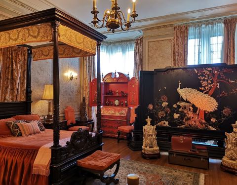 卡萨罗马城堡建于1911年,是有名金融家Henry Pellatt爵士的私人豪宅,这座中世纪风格的古堡耗资350万美金、耗时3年时间打造,由装饰华美的套房、800英尺的隧道、古塔、马厩和5英亩的花园构成。 楼层分布: 卡萨罗马城堡一楼为大厅,二楼是卧室和套房,三楼是女皇步枪博物馆,此外还有地下酒窖、室外花园和高塔。 一楼的大厅天花板是美丽的石膏和精致的雕花,从伊丽莎白时代的宫殿获取灵感而建。花园温室是较美的地方,地板是意大利大理石铺成,壮观的彩绘玻璃穹顶很是精美。藏书大厅的书柜高至天花板,宴会厅的装饰也是异常华美。 二楼以起居室、套房和客房为主。其中中式风格的套房内,摆放着许多中国漆木家具和瓷器,墙壁也以中式花纹为装饰。主卧室的天花板上,精致的蓝莓雕刻摇摇欲坠、十分逼真,虎皮地毯更是显示出主人的身份和地位。 三楼目前展出各种枪支兵器和资料。 地下室的酒窖现为复制品,走廊两侧挂满了在此取景的电影海报,语音导览和纪念品商店也位于这层。沿着地下密道可通往马厩、车库和温室。 沿着窄小的旋转楼梯,可以登上古塔的高层,透过小窗能欣赏到多伦多的市景。站在这里,还能听见呼啸的风声。